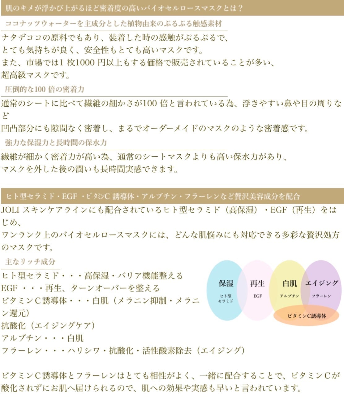 ヒト型セラミド・EGF・ビタミンC誘導体・アルブチン・フラーレン等、様々なお肌悩みに対応できる贅沢処方マスクです。